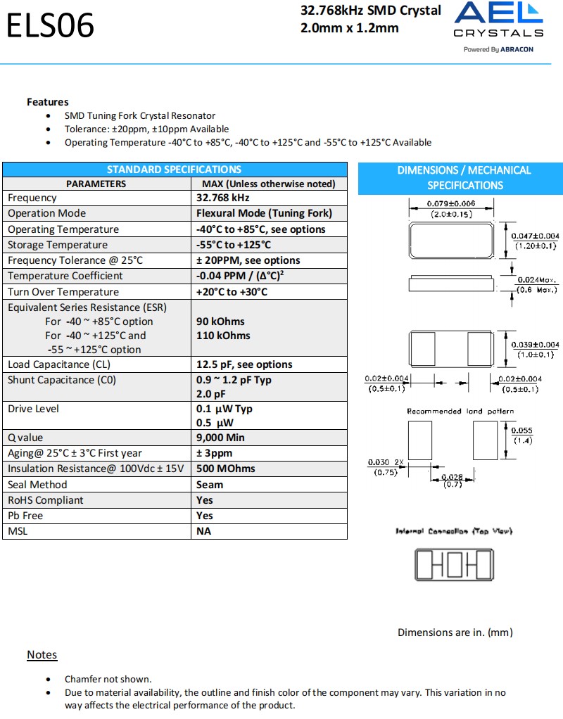 ELS06-32.768kHz-9-T,ELS06,32.768KHz,2012mm,AEL钟表电子晶振,参数表