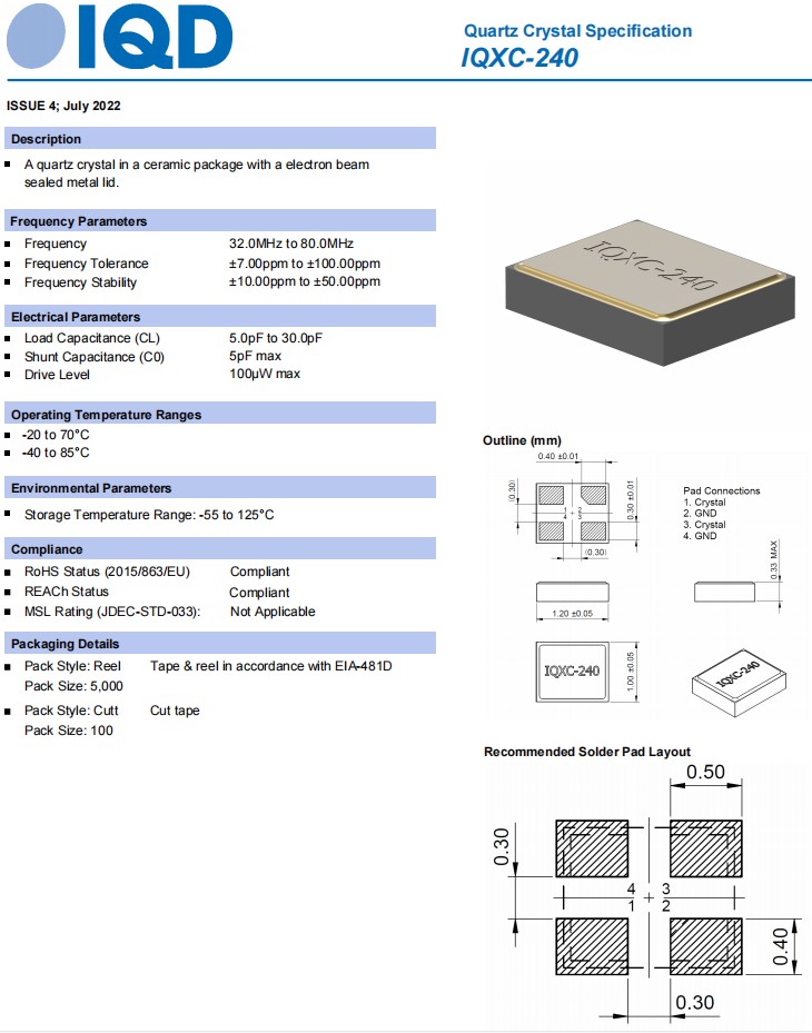 IQD晶振频率产品公司提供世界上最小的石英晶体IQXC-240,尺寸仅为1.2x1.0mm毫米,四脚贴片晶振,超微型石英晶体,高度仅为0.33毫米。IQXC-240频率范围为36MHz至80MHz,在-20至70°C的商用温度范围内,频率稳定性可低至10ppm,在-40至85°C的工业温度范围内,频率稳定性可低至15ppm,频率容差可低至7ppm。石英晶体谐振器符合最新一代微处理器的要求,负载电容可低至5pF。封装在带有电子束密封金属盖的4焊盘陶瓷密封封装中,有助于将EMI辐射降至最低。根据IEC 60068-2-27标准,该产品能够承受高达1000G的冲击。根据EIA-481D,IQXC-240贴片晶振可提供磁带和卷轴。超小型石英晶体IQXC-240非常适合物联网应用、VGA、USB和Wi-Fi等空间宝贵的应用。超微型石英晶体IQXC-240-32.0MHz非常适合物联网6G应用