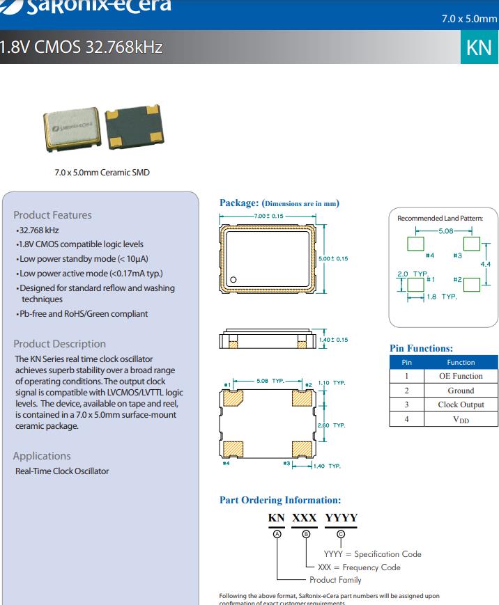 KN3270022特性:32.768千赫,1.8V CMOS兼容逻辑电平,低功耗待机模式(< 10μA),低功率有功模式(<0.17mA典型),设计为标准回流和清洗技术无铅,符合RoHS/绿色标准