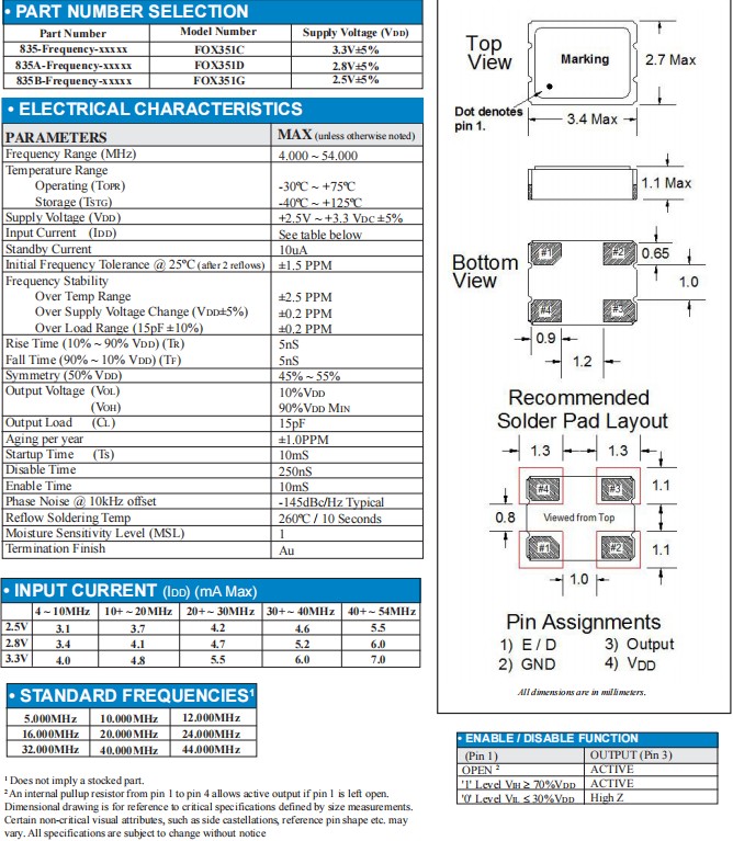 FOX晶振,FOX351C晶振,小体积薄型晶振,福克斯晶振公司自成立以来,Fox Electronics 一直是全球领先的频率控制解决方案供应商,拥有业内最广泛的先进频率控制产品,适合的应用从无线通信、计算机到仪器、航空航天等。该公司是锻造工艺突破方面的先驱,并因此而闻名,这一技术改变了频率控制行业的面貌。最近,该公司推出革命性的 XpressO 系列可配置振荡器,为购买者和设计人员带来了全新水平的交付灵活性,缩短了提前期并降低了成本.且完全不会折损最高的电气性能水平。Fox Electronics晶振主要生产石英晶体振荡器,贴片晶振,有源晶振,温补晶振等产品,所生产的产品受到各行各业的应用范围内,以技术占领市场,以质量赢得客户。