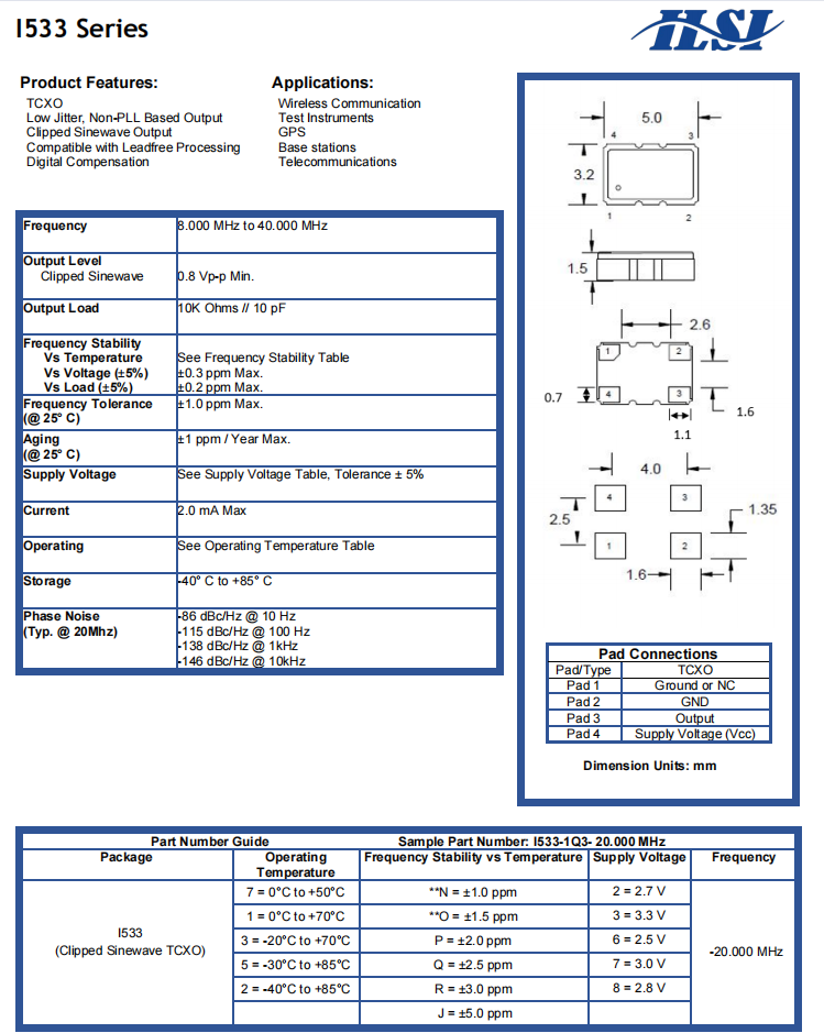 ILSI温补晶体振荡器,I533-1Q3-12.288MHz,GPS定位器晶振,参数表