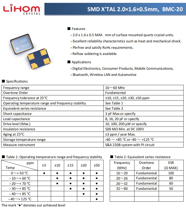 BMC-20,2016mm,Lihom力宏晶振,SMD石英晶体,蓝牙晶振,参数表