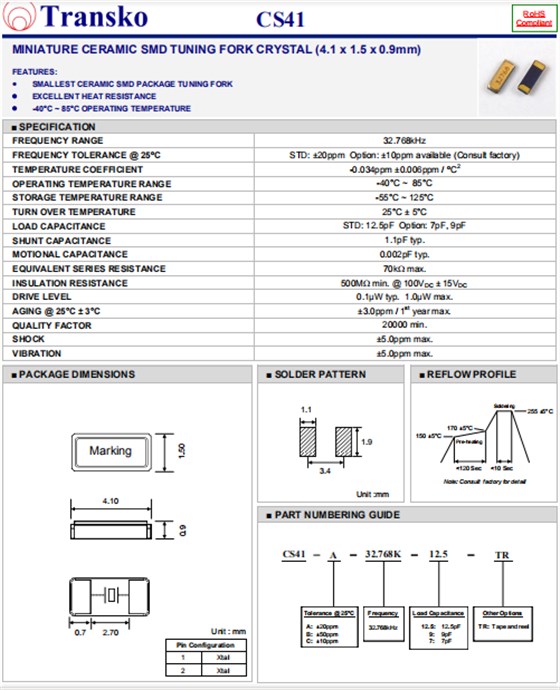 Transko晶振,高性能石英晶体,CS41无源晶振.小型贴片石英晶振,外观尺寸具有薄型表面贴片型石英晶体谐振器,特别适用于有小型化要求的市场领域,比如智能手机,无线蓝牙,平板电脑等电子数码产品.晶振本身超小型,薄型,重量轻,晶体具有优良的耐环境特性,如耐热性,耐冲击性,在办公自动化,家电相关电器领域及Bluetooth,WirelessLAN等短距离无线通信领域可发挥优良的电气特性,满足无铅焊接的回流温度曲线要求.