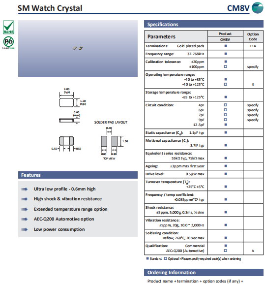 重复的温度巨大变化可能会降低受损害的32.768K晶振的产品特性,并导致塑料封装里的线路击穿.必须避免这种情况