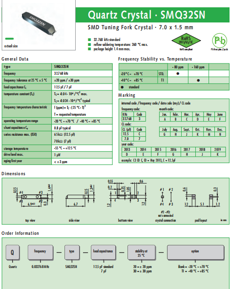 小体积32.768K时钟晶振,是贴片音叉晶体,千赫频率元件,应用于时钟模块,智能手机,全球定位系统,因产品本身体积小,SMD编带型,可应用于高性能自动贴片焊接,被广泛应用到各种小巧的便携式消费电子数码时间产品,环保性能符合ROHS/无铅标准.
