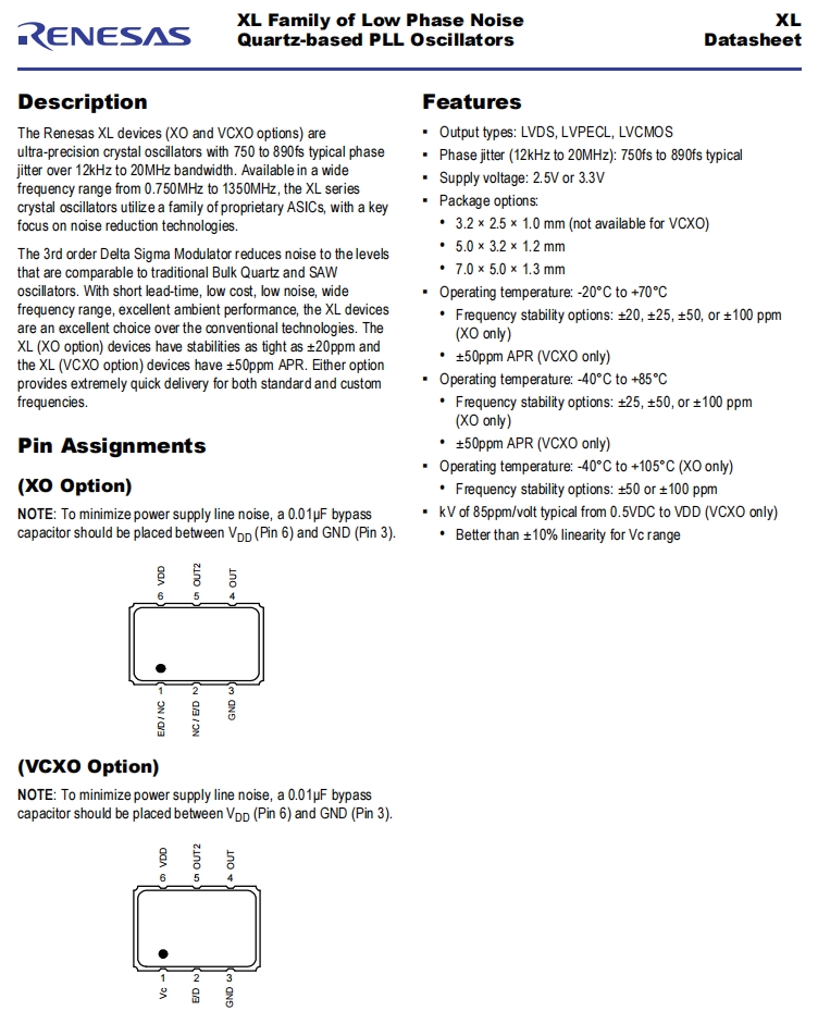 | XLP73V135.000000X | Renesas晶振 | XTAL OSC VCXO 135.0000MHZ LVPECL | XLP | 135 MHz | LVPECL | 3.3V | VCXO |