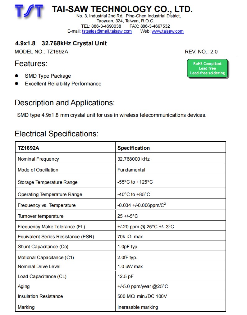 32.768KHz,TZ1692A,4918mm,TST谐振器,SMD石英晶体,参数表
